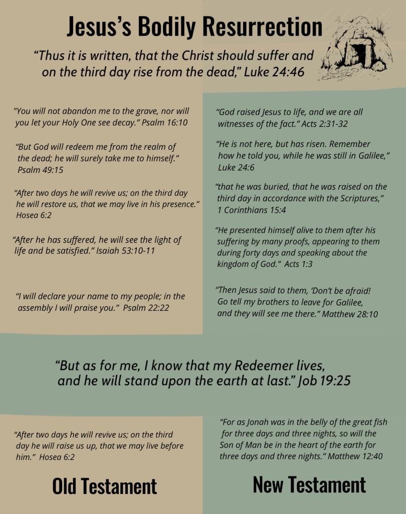 God is a Trinity (Matthew 28:18-20). The Son entered creation as Jesus of Nazareth (John 1:1-4). Jesus died on the cross for sins (Mark 10:32-34, 45). Jesus rose from the dead (Luke 24; 1 Cor 15).