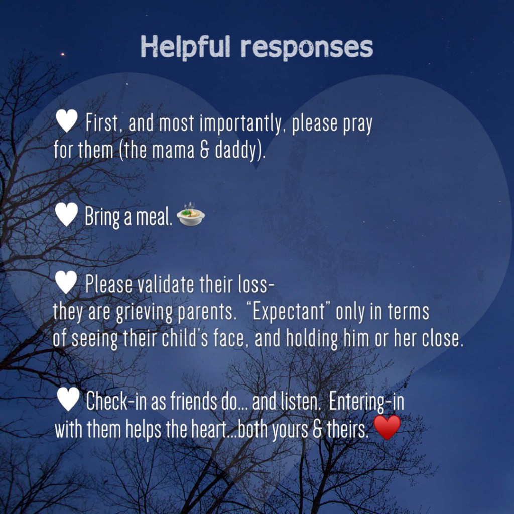 3) That attempts to comfort are appreciated. You might not feel confident in giving an “adequate” response (I can relate)…but please know that reaching-out means a great deal. Asking how they are doing and listening is like a hug for the heart.
