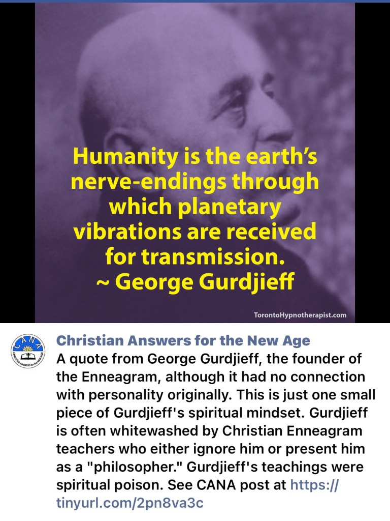 Contrary to claims made by Cron, Stabile, Rohr, McCord, and Heuertz, the Enneagram does not have ancient roots, nor is it Christian. Far from it, actually! The nine-pointed diagram itself was constructed in 1916 by an Armenian esoteric philosopher named, George Gurdjieff, as a way to know the secrets of cosmic reality. According to Gurdjieff’s pupil, P.D. Ouspensky (1878-1947), the enneagram circle with 9 points was designed as “…a ‘cosmic blueprint’ — a diagrammatic representation of the fundamental laws that create and sustain everything from the whole of Creation to individual organisms. The Enneagram demonstrates the interaction of the Law of Three and the Law of Seven that gives rise to all phenomena…All of Creation, the Physical world, the Subtle world, the Causal world and beyond that the Absolute – everything is contained in 9.” For more on this please click here.