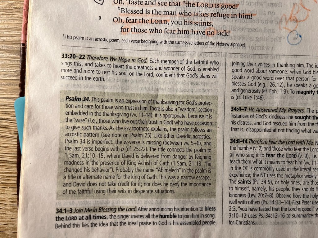 - Psalm 34:1 sn Psalm 34. In this song of thanksgiving the psalmist praises God for delivering him from distress. He encourages others to be loyal to the Lord, tells them how to please God, and assures them that the Lord protects his servants. The psalm is an acrostic; vv. 1-21 begin with successive letters of the Hebrew alphabet. (Verse 6 begins with the letter he (ה) and v. 7 with the letter zayin (ז). The letter vav (ו), which comes between ה and ז, seems to be omitted, although it does appear at the beginning of v. 6b. The final verse of the psalm, which begins with the letter pe (פ), is outside the acrostic scheme.