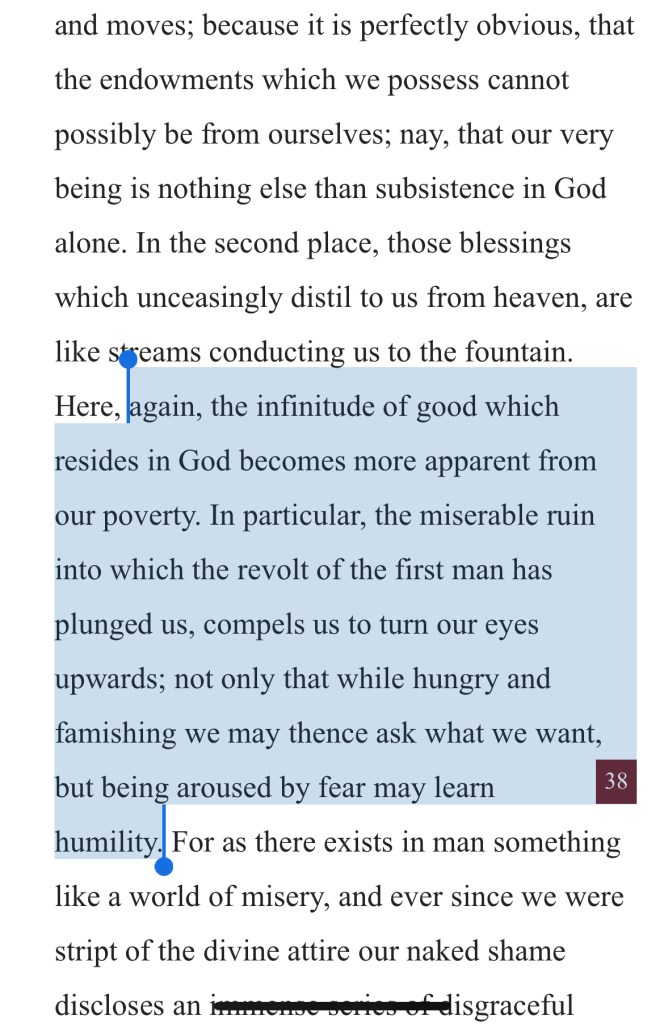 “the infinitude of good which resides in God becomes more apparent from our poverty. In particular, the miserable ruin into which the revolt of the first man has plunged us, compels us to turn our eyes upwards;” (Chapter 1 of Calvin’s Institutes).