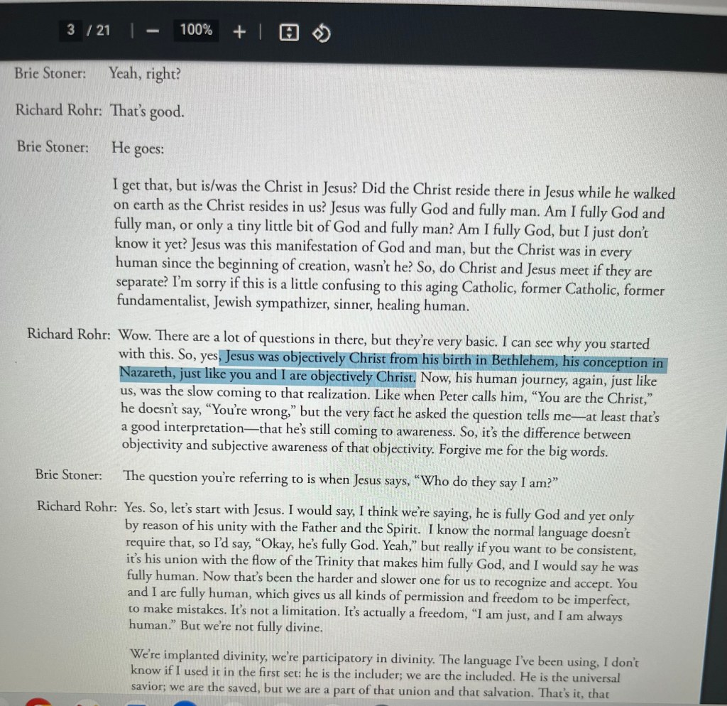 The highlighted portion is where Rohr expounds upon his teaching of what he calls the “True/Authentic Self,” which in Rohr’s theology is “the Christ.” He teaches that we all are the Christ just as Jesus was the Christ. This is more akin to Gnosticism,🚩 not Christianity.