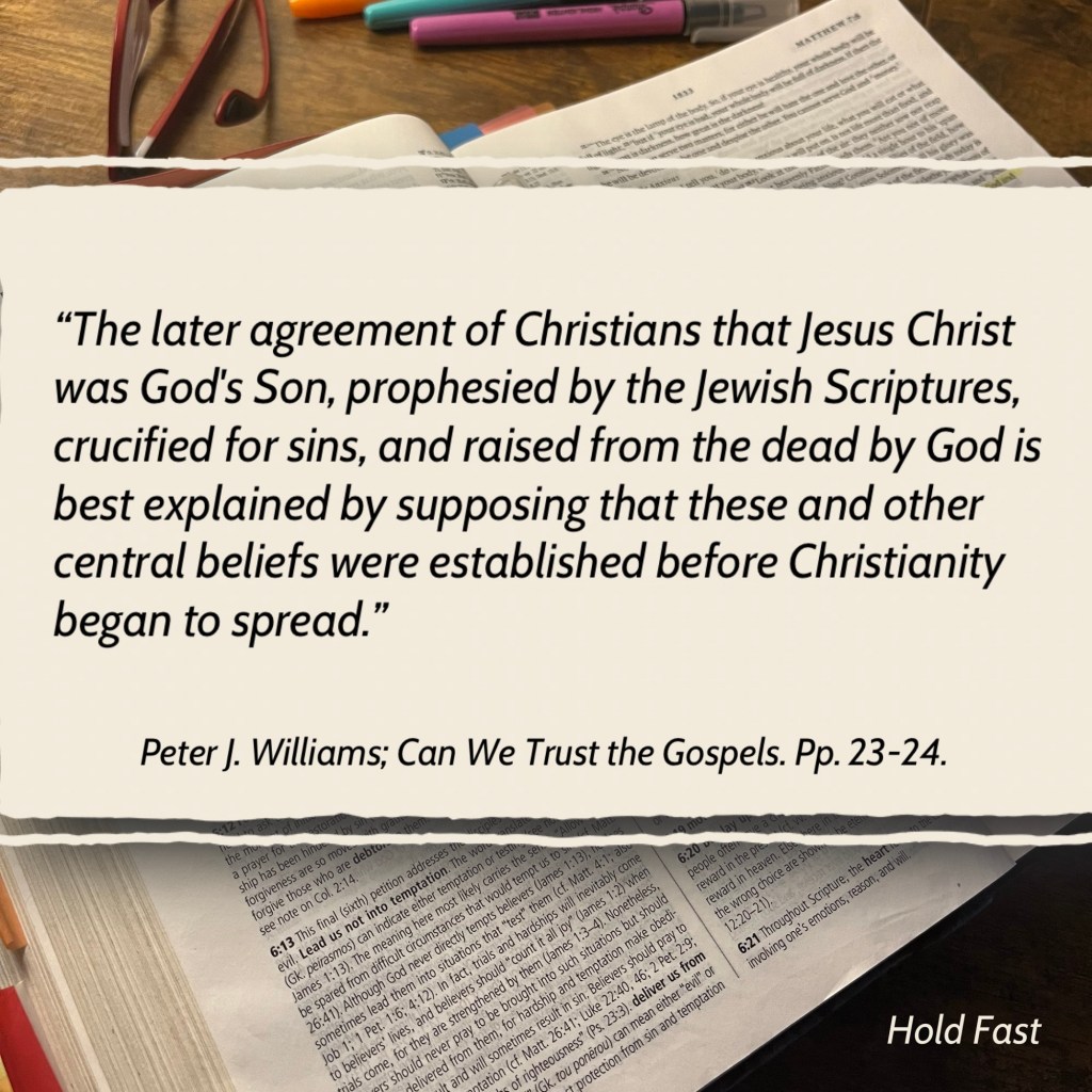 The later agreement of Christians that Jesus Christ was God’s Son, prophesied by the Jewish Scriptures, crucified for sins, and raised from the dead by God is best explained by supposing that these and other central beliefs were established before Christianity began to spread.”