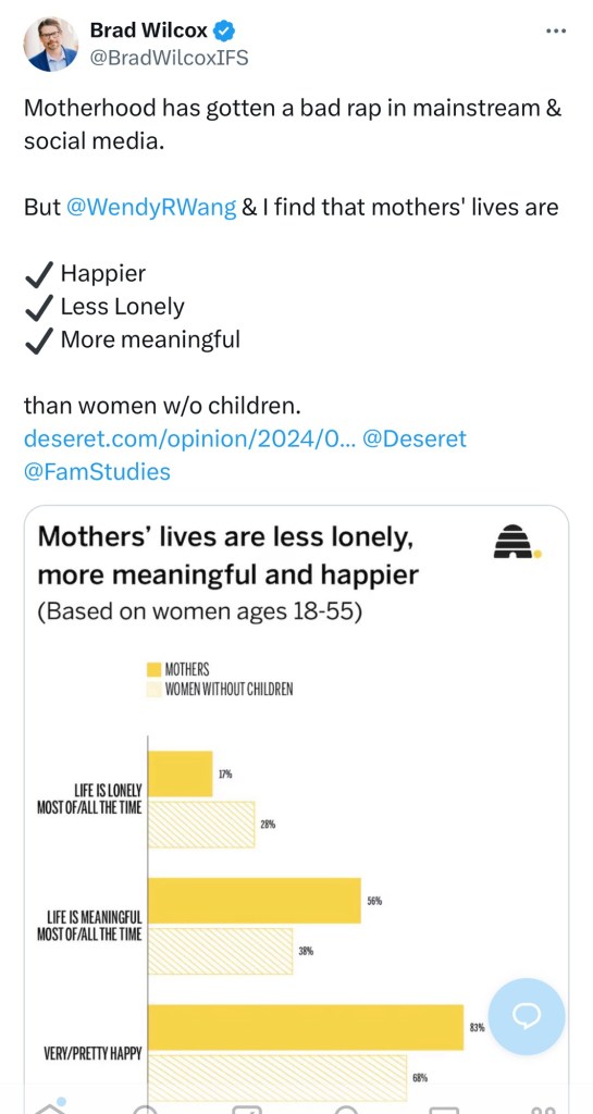 “More than 80% of mothers aged 18-55 are happy with their lives today, compared to 68% of women without children. And women who are marriedwith children are the happiest group of women, according to the most recent data from the 2022 General Social Survey. Moreover, mothers report markedly higher levels of meaning in their lives and less loneliness, compared to women without children.”
