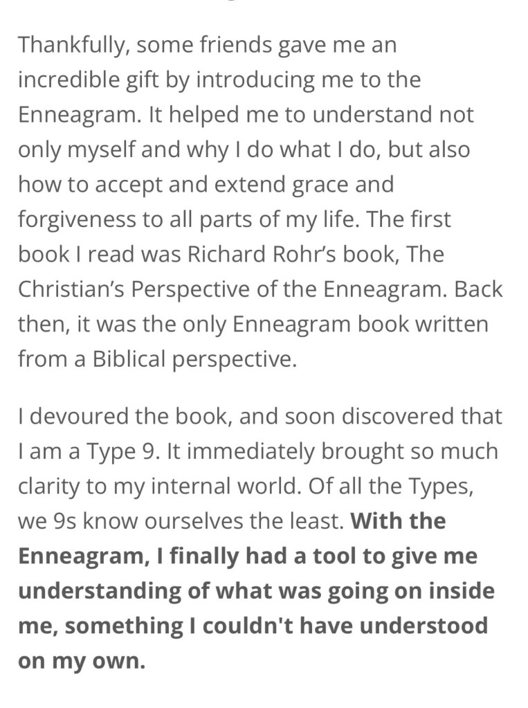“So how have we gotten so far off track? How do we heal ourselves from the false identities we’ve reinforced? Ultimately, how do we find our way home to the God of love and our true identity? This is where the Enneagram comes in. It reveals our path for recovering our true identity and helps us navigate the journey home to God.” (23)