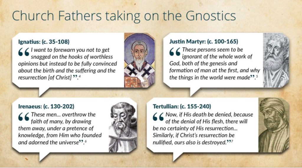 “Gnosticism presents a radically self-centred alternative gospel. Instead of pointing to Christ, Gnosticism proclaims that salvation comes from inside, finding your true identity within. It denies the goodness of the Creator and the glory of his creation. It denies the Incarnation, the resurrection and the need for redemption. Gnosticism sets itself against true Christianity at every point. It has been described as the ultimate heresy. This false teaching was faced by the Church in the second and third centuries AD.”